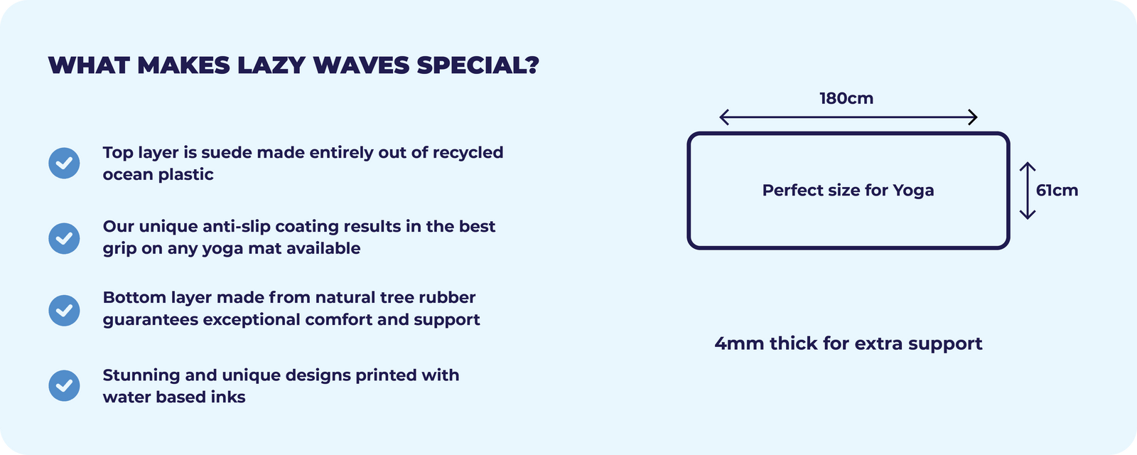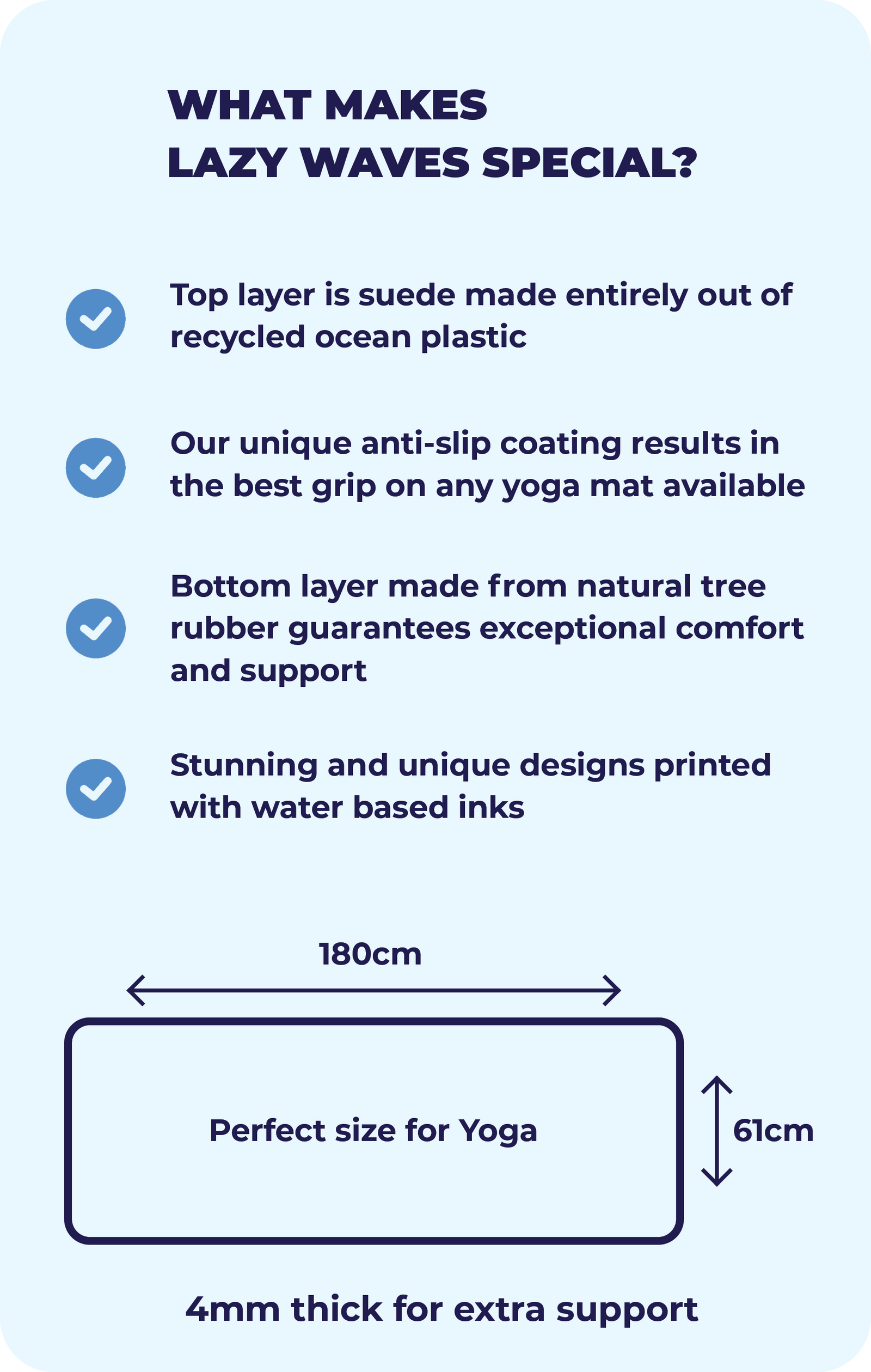 A thoughtfully designed yoga mat, that will help you escape the hustle and bustle of everyday life. Lazy Waves natural rubber mats have a grippy layer meaning both your yoga poses and mat will last longer.